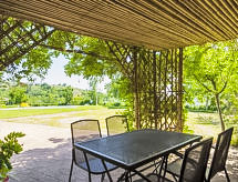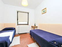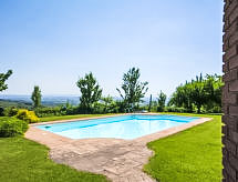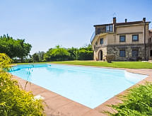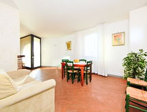 "Piscina", 3 -sobni apartman 70 m2, u prizemlju. Komforno i ukusno uređen: dnevni boravak/blagovaona s otvorenim kaminom i TV-om sa sat. prijemnikom. Izlaz na bazen. 1 bračna soba. 1 soba s 2 kreveta. Kuhinja (4 ploče za kuhanje, pećnica, perilica za suđe). Tuš/bidet/WC. Garnitura za sjedenje. Najviše 1 kućni ljubimac / pas dozvoljen.- postrojenja