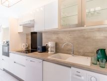 2 -sobni apartman 57 m2 na 1. katu, prema jugu. Komforno i moderno uređen: veliki dnevni boravak/blagovaona 25 m2 s 1 kaučem za 1 osobu (140 cm, dužina 190 cm), TV-om (plosnatim TV ekranom), klima uređajem. Izlaz na terasu. 1 soba s 1 franc. krevetom (1 x 160 cm, dužina 200 cm). Kuhinja (pećnica, perilica za suđe, 3 Indukcione ploče, toster, kuhalo za vodu, mikrovalna pećnica, el. aparat za kavu). Tuš, odv. WC. Terasa 10 m2, prema jugu. Garnitura za sjedenje. Lijep pogled na more. Na raspolaganju: perilica za rublje, glačalo, sušilo za kosu. Internet (wireless LAN [WLAN], besplatan). Dodatna informacija: 1 kućni ljubimac / pas dozvoljen. Protupožarni alarm. Ponuda od strane fizičke osobe u skladu s člankom 155, IV, CGI.- Značajke smještaja