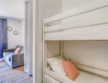 1 -sobni studio 20 m2 na 1. katu. Objekt pogodan za 2 odraslih + 2 djece. Potpuno renoviran godine 2020, komforno i lijepo uređen: predsoblje, bez prozora s 1 x 2 kreveta na kat (70 cm, dužina 170 cm). Dnevni boravak/blagovaona s 1 kaučem za 2 osobe (140 cm, dužina 200 cm), TV-om. Izlaz na terasu. Kuhinjska niša (pećnica, perilica za suđe, 2 staklokeramičke ploče za kuhanje, el. aparat za kavu). Tuš/WC. El. grijanje. Terasa 6 m2. Garnitura za sjedenje, električni roštilj. Na raspolaganju: Internet (wireless LAN [WLAN], uz doplatu). Parking br. 595. Dodatna informacija: 1 mali kućni ljubimac / pas dozvoljen. TV samo FR. Protupožarni alarm. 83112 000557 OF- Značajke smještaja