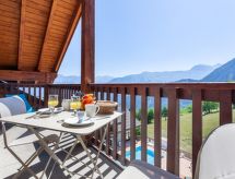 4 -sobni apartman 58 m2 na 3. katu, prema jugoistoku. Lijepo i udobno uređen: dnevni boravak/blagovaona s kosim stropom s 1 krevetom na izvlačenje (2 osobe 2 x 80 cm, dužina 190 cm), TV-om (plosnatim TV ekranom). Izlaz na balkon, prema jugoistoku. 1 soba s kosim stropom s 1 franc. krevetom (140 cm, dužina 190 cm), TV-om (plosnatim TV ekranom). Izlaz na balkon, prema jugoistoku. 1 soba s 1 x 2 kreveta na kat (80 cm, dužina 190 cm). 1 soba s kosim stropom s 2 kreveta (90 cm, dužina 190 cm). Otvorena kuhinja (perilica za suđe, 4 staklokeramičke ploče za kuhanje, toster, kuhalo za vodu, zamrzivač, el. aparat za kavu, raclette roštilj, kombinirana mikrovalna pećnica). Kada, tuš, odv. WC. El. grijanje. Tapison. Veliki balkon 7 m2, prema jugoistoku. Balkonski namještaj. Vrlo lijep pogled na planine, dolinu i bazen. Na raspolaganju: glačalo, sušilo za kosu. Internet (wireless LAN [WLAN], uz doplatu). Parking br. 157 (natkrit, 1 automobil), visina 190 cm. Dodatna informacija: apartman za nepušače. Protupožarni alarm. Bazen naveden u opisu je za privatno korištenje.- Značajke smještaja