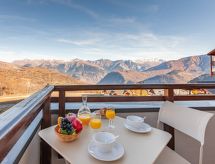 3 -sobni apartman 40 m2, u prizemlju, prema sjeveru. Lijepo i udobno uređen: dnevni boravak/blagovaona s 1 krevetom na izvlačenje (2 osobe 2 x 80 cm, dužina 190 cm), TV-om (plosnatim TV ekranom). Izlaz na balkon, prema sjeverozapadu. 1 soba s 1 franc. krevetom (140 cm, dužina 190 cm), TV-om (plosnatim TV ekranom). 1 soba s 1 x 2 kreveta na kat (80 cm, dužina 190 cm). Otvorena kuhinja (perilica za suđe, 4 staklokeramičke ploče za kuhanje, toster, kuhalo za vodu, mikrovalna pećnica, el. aparat za kavu, raclette roštilj, set za fondue (sir)). Kada, tuš, odv. WC. El. grijanje. Tapison. Veliki balkon 9 m2, prema sjeverozapadu. Balkonski namještaj. Lijep pogled na planine i dolinu. Na raspolaganju: glačalo, sušilo za kosu. Internet (wireless LAN [WLAN], uz doplatu). Parking br. 159 (natkrit, 1 automobil) na 190 m. Dodatna informacija: apartman za nepušače. Protupožarni alarm.- Značajke smještaja