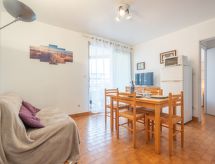 2 -sobni apartman 28 m2 na 5. katu, prema sjeveroistoku. Jednostavno uređen: dnevni boravak/blagovaona s 1 kaučem za 2 osobe (1 x 140 cm, dužina 190 cm), stolom za blagovanje i TV-om (plosnatim TV ekranom), el. peći. Izlaz na terasu. 1 soba s 1 franc. krevetom (1 x 140 cm, dužina 190 cm), el. peći. Izlaz na terasu. Otvorena kuhinja (2 ploče za kuhanje, mini pećnica, el. aparat za kavu). Kada, odv. WC. Terasa 7 m2, mala terasa 4 m2. Balkonski namještaj. Pogled na more. Na raspolaganju: perilica za rublje. Internet (wireless LAN [WLAN], uz doplatu). Dodatna informacija: protupožarni alarm.- Značajke smještaja