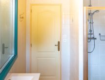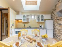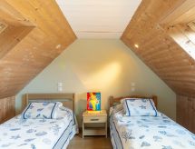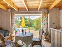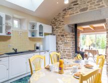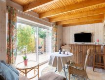 "Les Bambous (GUI110)", 3 -sobna kuća 60 m2 na 2 etaže. Svrsishodno i rustikalno uređena: dnevni boravak/blagovaona s švedskom peći, stolom za blagovanje, TV-om sa sat. prijemnikom i muzičkom linijom. Izlaz na terasu. 1 soba s 1 franc. krevetom (160 cm), umivaonikom. Otvorena kuhinja (pećnica, perilica za suđe, 4 staklokeramičke ploče za kuhanje, toster, kuhalo za vodu, mikrovalna pećnica, zamrzivač, el. aparat za kavu) s stolom za blagovanje. Tuš, odv. WC. Gornji kat: 1 soba s kosim stropom, visina stropa 180 - 200 cm s 2 kreveta. Odv. WC. El. grijanje. Parketni pod. Terasa, prema jugu. Garnitura za sjedenje, vrtni roštilj (prijenosni), ležaljke (2). Na raspolaganju: perilica za rublje, glačalo, visoka dječja stolica, dječji krevetić. Internet (wireless LAN [WLAN], besplatan). Dodatna informacija: kuća za nepušače. Najviše 1 mali kućni ljubimac / pas dozvoljen.- postrojenja