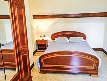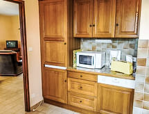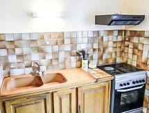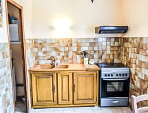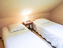 4 -sobna kuća 94 m2. Lijepo i rustikalno uređena: dnevni boravak/blagovaona s otvorenim kaminom, stolom za blagovanje i TV-om (plosnatim TV ekranom). Izlaz na terasu. Otvorena kuhinja (pećnica, perilica za suđe, 1 staklokeramičke ploče za kuhanje, 3 plamena za kuhanje, toster, kuhalo za vodu, mikrovalna pećnica, zamrzivač, el. aparat za kavu) s malim stolom za blagovanje. Kada, odv. WC. Bojlerom (200 litara). Gornji kat: 1 soba s kosim stropom s 2 kreveta (90 cm, dužina 190 cm). 2 sobe s kosim stropom, svaka soba s 1 franc. krevetom (140 cm, dužina 190 cm). Odv. WC. Terasa 15 m2 (natkrita). Garnitura za sjedenje, vrtni roštilj (prijenosni), ležaljke (6). Na raspolaganju: perilica za rublje, glačalo, dječji krevetić do 2 godine, drvo (uz doplatu). Parking (2 automobila). Dodatna informacija: prikladno za obitelji. Kuća za nepušače. 1 kućni ljubimac / pas dozvoljen. Protupožarni alarm.- postrojenja