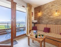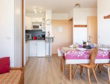 "Bâtiment B", 2 -sobni apartman 32 m2 na 4. katu, prema sjeveru. Svrsishodno i lijepo uređen: dnevni boravak/blagovaona s 1 krevetom na izvlačenje (2 osobe 2 x 80 cm, dužina 190 cm), TV-om (plosnatim TV ekranom), muzičkom linijom. Izlaz na balkon, prema sjeveru. 1 soba s 2 kreveta (90 cm, dužina 190 cm). Izlaz prema sjeveru. Kuhinjska niša (mini pećnica, perilica za suđe, 4 staklokeramičke ploče za kuhanje, toster, kuhalo za vodu, el. aparat za kavu, raclette roštilj, kombinirana mikrovalna pećnica, set za fondue (sir)). Kada, odv. WC. El. grijanje. Parketni pod. Balkon 4 m2, prema sjeveru. Balkonski namještaj. Lijep pogled na dolinu. Na raspolaganju: glačalo, sušilo za kosu. Internet (wireless LAN [WLAN], uz doplatu). Dodatna informacija: apartman za nepušače. Najviše 1 kućni ljubimac / pas dozvoljen. Protupožarni alarm.- Značajke smještaja