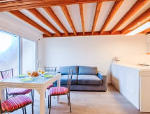 3 -sobni apartman 41 m2 na 2 etaže na 1. katu. Svrsishodno i lijepo uređen: dnevni boravak/blagovaona s panoramskim prozorom s TV-om (plosnatim TV ekranom). Izlaz na balkon. 1 soba s 1 franc. krevetom (1 x 140 cm, dužina 190 cm). Kuhinjska niša (mini pećnica, perilica za suđe, 2 staklokeramičke ploče za kuhanje, el. aparat za kavu). Odv. WC. Gornji kat: 1 dječja soba s 1 x 2 kreveta na kat (90 cm, dužina 190 cm). Kada. El. grijanje. Balkonski namještaj. Bočni pogled na bazen. Na raspolaganju: perilica za rublje. Internet (wireless LAN [WLAN], besplatan). Parking br. 1-7. Dodatna informacija: protupožarni alarm.- Značajke smještaja