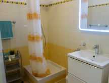 4 -sobna kuća u nizu 116 m2 na 2 etaže. 2 sobe, svaka soba s 2 kreveta (90 cm, dužina 190 cm). 1 soba s 1 franc. krevetom (140 cm, dužina 190 cm). Mala kuhinja (4 ploče za kuhanje, pećnica, mikrovalna pećnica). Kada/WC, tuš, odv. WC. Gornji kat: dnevni boravak/blagovaona 37 m2 s TV-om sa sat. prijemnikom, radiom i CD-om. Izlaz na terasu. Kuhinja (4 ploče za kuhanje, pećnica, perilica za suđe, mikrovalna pećnica). Grijanje. Velika terasa 28 m2, prema jugu, mali vrt 65 m2, prema sjeveru i prema zapadu. Garnitura za sjedenje, vrtni roštilj, ležaljke. Na raspolaganju: perilica za rublje, sušilica. Internet (wireless LAN [WLAN], uz doplatu). Parking (ograđen). Dodatna informacija: protupožarni alarm.- Aktivnosti u blizini
