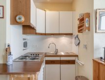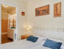 2 -sobni apartman 34 m2 na 1. katu. Komforno uređen: dnevni boravak/blagovaona s TV-om (plosnatim TV ekranom). 1 soba s 2 kreveta (90 cm, dužina 190 cm). Izlaz na terasu. Kuhinjska niša (4 ploče za kuhanje, pećnica, kuhalo za vodu, zamrzivač, el. aparat za kavu, kombinirana mikrovalna pećnica). Kada, odv. WC. El. grijanje. Mala terasa 5 m2. Garnitura za sjedenje. Na raspolaganju: perilica za rublje. Internet (wireless LAN [WLAN], uz doplatu). Parking br. 5. Dodatna informacija: 1 kućni ljubimac / pas dozvoljen. Protupožarni alarm.- Značajke smještaja