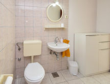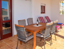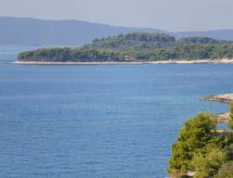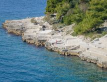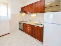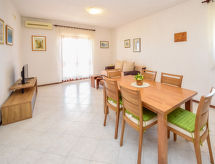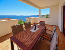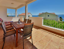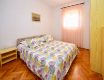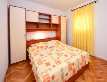 4 -sobni apartman 90 m2 na 1. katu. Udobno uređen: dnevni boravak/blagovaona 32 m2 s TV-om sa sat. prijemnikom i klima uređajem. Izlaz na terasu. 2 bračne sobe. 1 soba s 1 krevetom (90 cm, dužina 190 cm). Kuhinjska niša (4 ploče za kuhanje, pećnica, zamrzivač, el. aparat za kavu). Kada/bidet/WC, odv. WC. Velika terasa 27 m2 (natkrita), prema jugu. Garnitura za sjedenje, ležaljke (2). Prekrasan pogled na more. Na raspolaganju: perilica za rublje, dječji krevetić. Internet (wireless LAN [WLAN], besplatan). Internet wireless dostupan samo u periodu 01.05.-31.10.- postrojenja