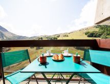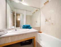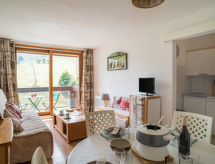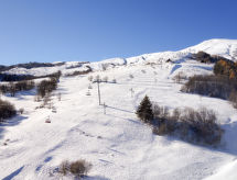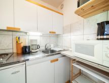 1 -sobni studio 28 m2 na 17. katu, prema jugu. Jednostavno i svrsishodno uređen: dnevni boravak/blagovaona s 1 kaučem za 2 osobe (140 cm, dužina 190 cm), TV-om (plosnatim TV ekranom). Izlaz na balkon, prema jugu. Niša za spavanje s zavjesom s 1 x 2 kreveta na kat (80 cm, dužina 190 cm). Kuhinjska niša (2 ploče za kuhanje, mini pećnica, toster, mikrovalna pećnica, el. aparat za kavu, raclette roštilj, set za fondue (sir)). Kada, odv. WC. El. grijanje. Parketni pod. Balkon 4 m2, prema jugu. Pogled na skijašku stazu. Na raspolaganju: glačalo, sušilo za kosu. Internet (wireless LAN [WLAN], uz doplatu). Dodatna informacija: apartman za nepušače. Protupožarni alarm.- postrojenja