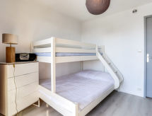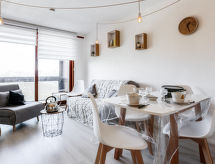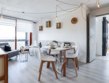 2 -sobni apartman 33 m2 na 17. katu, prema sjeveru. Potpuno renoviran godine 2019, svrsishodno i moderno uređen: dnevni boravak/blagovaona s 1 kaučem za 2 osobe (140 cm, dužina 190 cm), plosnatim TV ekranom i električnim roletnama. Izlaz na balkon, prema sjeveru. 1 soba s 1 x 1 kreveta na kat (90 cm, dužina 190 cm), 1 franc. krevetom (140 cm, dužina 190 cm), radiom i električnim roletnama. Izlaz na balkon, prema istoku. Kuhinja/dn. boravak (perilica za suđe, 2 Indukcione ploče, toster, kuhalo za vodu, zamrzivač, el. aparat za kavu, raclette roštilj, kombinirana mikrovalna pećnica). Kada, odv. WC. El. grijanje. Parketni pod. Balkon 4 m2, prema sjeveru, balkon 5 m2, prema istoku. Balkonski namještaj, ležaljke (2). Pogled na planine. Na raspolaganju: glačalo, sušilo za kosu. Internet (wireless LAN [WLAN], uz doplatu). Dodatna informacija: apartman za nepušače. Protupožarni alarm.- postrojenja