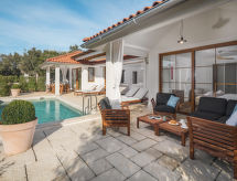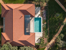 "Luxury Beach Villas Porto Bus", 3 -sobna vila 125 m2. Objekt pogodan za 4 odraslih + 2 djece. Dnevni boravak/blagovaona s 1 kaučem za 2 osobe (160 cm, dužina 200 cm), TV-om (plosnatim TV ekranom), klima uređajem. Izlaz na terasu. 2 sobe, svaka soba s 1 bračnim krevetom (2 x 90 cm, dužina 200 cm), tušem/WC-om i klima uređajem. Izlaz na terasu. Otvorena kuhinja (4 ploče za kuhanje, pećnica, perilica za suđe, toster, kuhalo za vodu, mikrovalna pećnica, el. aparat za kavu). Grijanje. Terasa 35 m2 (natkrita) terasa 35 m2. Garnitura za sjedenje, ležaljke. Na raspolaganju: perilica za rublje, sušilica, sef, glačalo, sušilo za kosu. Internet (wireless LAN [WLAN], besplatan). Punionica za električna vozila. Dodatna informacija: kuća za nepušače. 2 mala kućna ljubimca / psa dozvoljena. Rezervira se tipski objekt (kuća, apartman) i moguća su manja odstupanja. .- postrojenja