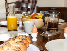 4 -sobna obiteljska kuća na 2 etaže. Prostrano i svijetlo, komforno i ukusno uređena: otvoreni dnevni boravak s TV-om, plosnatim TV ekranom, DVD-om i peći na drva. Otvorena kuhinja (4 ploče za kuhanje, pećnica, perilica za suđe, mikrovalna pećnica, zamrzivač) s stolom za blagovanje. Odv. WC. Grijanje. Gornji kat: 2 bračne sobe, svaka soba s 1 bračnim krevetom. 1 soba s 2 kreveta. Kada/tuš/WC. Grijanje. Vrtni roštilj. Lijep pogled na krajolik. Na raspolaganju: perilica za rublje. Internet (wireless LAN [WLAN], besplatan). Dodatna informacija: kuća za nepušače. 2 kućna ljubimca / psa dozvoljena.- Značajke smještaja