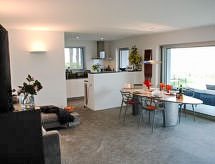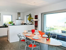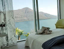 "“la propriété du bonheur“", 5 -sobna vila na 3 etaže. Prostrano i svijetlo, ukusno i stilski uređena: otvoreni veliki dnevni boravak/blagovaona s panoramskim prozorom s švedskom peći, kabelskom TV, plosnatim TV ekranom, radiom i muzičkom linijom. Izlaz u vrt, na terasu, pergola, na mjesto za sjedenje u vrtu. Otvorena kuhinja (pećnica, perilica za suđe, 4 staklokeramičke ploče za kuhanje, el. aparat za kavu, Doze za mašinu za kavu (Nespresso) uz doplatu, raclette roštilj, set za fondue (sir)) s barom, stolom za blagovanje. Izlaz u vrt. Tuš/WC. Podno grijanje. Gornji kat: 2 bračne sobe s panoramskim prozorom prema jugu i prema istoku, svaka soba s 1 bračnim krevetom (2 x 90 cm, dužina 200 cm), tušem/WC-om i duplim umivaonikom. Povezna soba s 1 krevetom (90 cm, dužina 200 cm). Mali salon s panoramskim prozorom. 2. Gornji kat: otvoreni veliki dnevni boravak s panoramskim prozorom s bibliotekom. Izlaz na terasu. Velika vrtna terasa (djelomično natkrita), velika sjenica. Garnitura za sjedenje, vrtni roštilj, ležaljke (4), mjesto za sjedenje. Prekrasan panoramski pogled na jezero, planine i krajolik. Na raspolaganju: glačalo, visoka dječja stolica, dječji krevetić do 2 godine (uz doplatu), sušilo za kosu. Internet (wireless LAN [WLAN], besplatan). Dodatna informacija: kuća za nepušače. Najviše 1 kućni ljubimac / pas dozvoljen. Vatrogasni aparat.- postrojenja