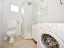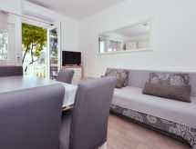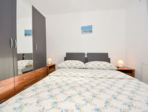 4 -sobni apartman 85 m2 na 1. katu, prema jugozapadu. Dnevni boravak/blagovaona 15 m2 s 1 kaučem za 1 osobu (135 cm, dužina 190 cm), TV-om sa sat. prijemnikom (plosnatim TV ekranom), klima uređajem. Izlaz na terasu. 1 soba s 1 bračnim krevetom (2 x 70 cm, dužina 200 cm). 1 soba s 1 franc. krevetom (160 cm, dužina 200 cm). 1 soba s 1 franc. krevetom (160 cm, dužina 200 cm). Izlaz na terasu. Otvorena kuhinja (4 ploče za kuhanje, pećnica, mikrovalna pećnica, el. aparat za kavu). Tuš/WC. Terasa 55 m2 (djelomično natkrita). Garnitura za sjedenje, vrtni roštilj, ležaljke (2). Pogled u daljini na more. Na raspolaganju: perilica za rublje. Internet (wireless LAN [WLAN], besplatan).- postrojenja