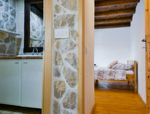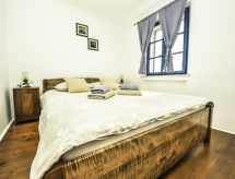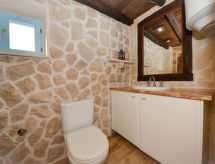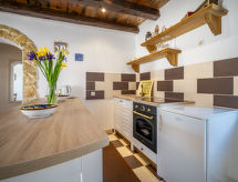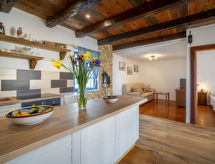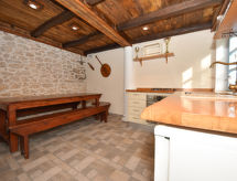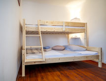 3 -sobna polovica dvojne kuće 80 m2 na 1. katu, prema jugu. Dnevni boravak/blagovaona 24 m2 s TV-om sa sat. prijemnikom (plosnatim TV ekranom), klima uređajem. Izlaz na terasu. 1 soba s 1 franc. krevetom (160 cm, dužina 200 cm). 1 soba s 1 x 2 kreveta na kat (90 cm, dužina 200 cm). Otvorena kuhinja (pećnica, 4 staklokeramičke ploče za kuhanje, el. aparat za kavu). Tuš/WC. Klima uređaj (uz doplatu). Terasa 60 m2. Garnitura za sjedenje, vrtni roštilj (prijenosni), ležaljke. Na raspolaganju: visoka dječja stolica, dječji krevetić, sušilo za kosu. Internet (wireless LAN [WLAN], besplatan). 1 kućni ljubimac / pas dozvoljen.- postrojenja
