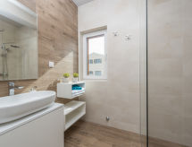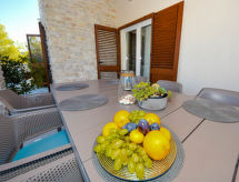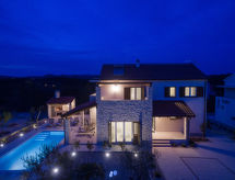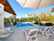 5 -sobna vila 170 m2 na 2 etaže, prema sjeverozapadu. Dnevni boravak/blagovaona 60 m2 s TV-om sa sat. prijemnikom (plosnatim TV ekranom), klima uređajem. Izlaz na terasu. 1 soba s 1 franc. krevetom (160 cm, dužina 200 cm), tušem/WC-om i klima uređajem. Otvorena kuhinja (pećnica, perilica za suđe, 4 staklokeramičke ploče za kuhanje, mikrovalna pećnica, zamrzivač, el. aparat za kavu). Odv. WC. Gornji kat: predsoblje. Izlaz na terasu. 1 soba s 1 franc. krevetom (160 cm, dužina 200 cm), tušem/WC-om i TV-om sa sat. prijemnikom (plosnatim TV ekranom), klima uređajem. Izlaz na terasu. 2 sobe, svaka soba s 1 franc. krevetom (160 cm, dužina 200 cm), klima uređajem. Tuš/WC. Podno grijanje. Terasa 15 m2 (natkrita), 2 terase 8 m2. Garnitura za sjedenje, ležaljke. Pogled u daljini na more. Na raspolaganju: sušilo za kosu. Internet (wireless LAN [WLAN], besplatan).- postrojenja