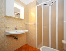2 -sobni apartman 30 m2. Ukusno uređen: dnevno-spavaća soba s 1 kaučem za 2 osobe, stolom za blagovanje, kuhinjskim blokom i TV-om sa sat. prijemnikom. Izlaz na balkon. 1 bračna soba. Otvorena kuhinja (Plinski štednjak, 4 plamena za kuhanje, mikrovalna pećnica, el. aparat za kavu). Tuš/WC. Klima uređaj, grijanje toplim zrakom. Grijanje samo u pojedinim prostorijama. Balkon ili terasa (natkrita). Balkonski namještaj. Na raspolaganju: visoka dječja stolica, dječji krevetić. Internet (wireless LAN [WLAN], besplatan). Parking (1 automobil) uz kuću.- postrojenja