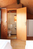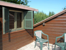 "Dog's Bungalow", 2 -sobna kuća u nizu 45 m2 na 2 etaže. Svrsishodno uređena: dnevno-spavaća soba s 1 kaučem za 2 osobe i 1 x 2 kreveta na kat, stolom za blagovanje, TV-om sa sat. prijemnikom, klima uređajem i grijanjem na topli zrak. Izlaz na terasu. 1 bračna soba. Otvorena kuhinja (4 plamena za kuhanje, mikrovalna pećnica). Tuš/WC. Grijanje samo u pojedinim prostorijama. Gornji kat: (kružne stepenice) s kosim stropom, otvorena galerija s 2 kreveta i odv. WC-om. Mali vrt. Garnitura za sjedenje. Na raspolaganju: sef (uz doplatu). Parking. Dodatna informacija: hladnjak bez zamrzivača. Najviše 2 kućna ljubimca / psa dozvoljena. Vlastiti ulaz. Katovi nisu interno povezani. Raspored kreveta je fleksibilan. Dostupno je više mogućnosti za spavanje od maksimalno dopuštenog broja osoba koji se ipak ne smije prekoračiti- postrojenja