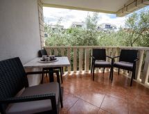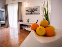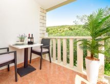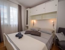 2 -sobni apartman 32 m2 na 2. katu. Lijepo i ukusno uređen: dnevni boravak/blagovaona s 1 kaučem za 2 osobe (160 cm, dužina 200 cm), TV-om sa sat. prijemnikom (plosnatim TV ekranom), klima uređajem. Izlaz na balkon. 1 soba s 1 franc. krevetom (160 cm, dužina 200 cm). Otvorena kuhinja (2 staklokeramičke ploče za kuhanje, mikrovalna pećnica, zamrzivač, el. aparat za kavu). Tuš/WC. Klima uređaj (uz doplatu). Balkon 6 m2. Garnitura za sjedenje. Na raspolaganju: Internet (wireless LAN [WLAN], uz doplatu).- postrojenja