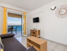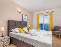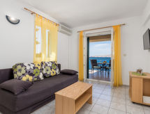 "Marina (SNJ102)", 2 -sobni apartman 45 m2 na 1. katu. Dnevni boravak/blagovaona s 1 franc. krevetom (160 cm, dužina 200 cm), TV-om sa sat. prijemnikom i klima uređajem. Izlaz na balkon. 1 soba s 1 franc. krevetom (160 cm, dužina 200 cm). Izlaz na balkon. Otvorena kuhinja (4 ploče za kuhanje, toster, mikrovalna pećnica, zamrzivač, el. aparat za kavu). Tuš/WC. Balkon. Balkonski namještaj. Pogled na more. Na raspolaganju: Internet (wireless LAN [WLAN], besplatan). Dodatna informacija: kuća za nepušače. Najviše 1 kućni ljubimac / pas dozvoljen.- postrojenja
