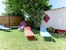 "Marmotte (PGF103)", 3 -sobna kuća u nizu 70 m2, u prizemlju. Svrsishodno i lijepo uređena: dnevni boravak/blagovaona s stolom za blagovanje i TV-om. 1 soba s 1 franc. krevetom (140 cm, dužina 190 cm). Izlaz na terasu. 1 soba s 2 kreveta (90 cm, dužina 190 cm). Izlaz na terasu. Mala, otvorena kuhinja (pećnica, 3 staklokeramičke ploče za kuhanje, toster, kuhalo za vodu, mikrovalna pećnica, zamrzivač, el. aparat za kavu). Tuš, odv. WC. El. grijanje. Parketni pod. Terasa. Garnitura za sjedenje, vrtni roštilj (prijenosni), ležaljke (4). Na raspolaganju: perilica za rublje, glačalo, visoka dječja stolica, dječji krevetić, sušilo za kosu. Internet (wireless LAN [WLAN], besplatan). Dodatna informacija: kuća za nepušače. Protupožarni alarm.- postrojenja