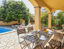 4 -sobna kuća 90 m2. Svrsishodno uređena: dnevni boravak/blagovaona s otvorenim kaminom i digitalnim TV. Izlaz na terasu, na bazen. 1 soba s 1 franc. krevetom (150 cm, dužina 190 cm), kadom/bidetom/WC-om. 1 soba s 1 franc. krevetom (150 cm, dužina 190 cm). 1 soba s 2 kreveta (90 cm, dužina 190 cm). Otvorena kuhinja (pećnica, perilica za suđe, toster, kuhalo za vodu). Tuš/bidet/WC. Balkon. Garnitura za sjedenje, vrtni roštilj, ležaljke (6). Pogled na planine. Na raspolaganju: perilica za rublje, visoka dječja stolica, dječji krevetić do 2 godine. Internet (wireless LAN [WLAN], besplatan). Dodatna informacija: kuća za nepušače. TV samo ES. HUTG-000927- Značajke smještaja