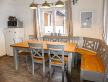 6 -sobna kuća 170 m2 na 3 etaže, u povišenom prizemlju. Djelomično renovirana godine 2017, jednostavno i udobno uređena: predsoblje. Dnevni boravak s švedskom peći i kabelskom TV (plosnatim TV ekranom). Izlaz na terasu. 1 bračna soba s kabelskom TV (plosnatim TV ekranom). Velika kuhinja (pećnica, 4 staklokeramičke ploče za kuhanje, mikrovalna pećnica) s stolom za blagovanje. Kada/WC. (300 litara). Donji kat: veliki dnevni boravak/blagovaona 24 m2. Gornji kat: 1 bračna soba s umivaonikom i kabelskom TV (plosnatim TV ekranom). Izlaz na balkon. 1 bračna soba s umivaonikom. Izlaz na balkon. 1 bračna soba s kabelskom TV (plosnatim TV ekranom). Soba za prtljagu. Odv. WC. Balkon 7 m2, velika terasa 21 m2. Garnitura za sjedenje. Lijep pogled na planine. Na raspolaganju: Internet (wireless LAN [WLAN], besplatan). Dodatna informacija: prikladno za obitelji. Kuća za nepušače. 50615-000272-2020- postrojenja