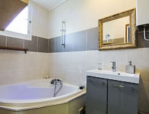 4 -sobna kuća 95 m2. Komforno uređena: dnevni boravak/blagovaona s TV-om. 1 soba s 1 franc. krevetom (140 cm). 1 soba s 1 bračnim krevetom (2 x 90 cm). 1 soba s 2 kreveta (90 cm). Velika kuhinja (perilica za suđe, 4 Indukcione ploče, mikrovalna pećnica) s stolom za blagovanje. Izlaz u vrt. Kada, odv. WC. Terasa. Garnitura za sjedenje, vrtni roštilj. Na raspolaganju: perilica za rublje. Internet (wireless LAN [WLAN], uz doplatu). Dodatna informacija: protupožarni alarm.- postrojenja