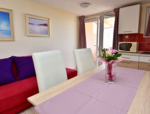 3 -sobni apartman 65 m2 na 2. katu. Dnevni boravak/blagovaona s 1 kaučem za 1 osobu, TV-om sa sat. prijemnikom i klima uređajem. Izlaz na terasu. 1 soba s 1 bračnim krevetom (2 x 90 cm, dužina 200 cm). 1 soba s 1 krevetom (90 cm, dužina 200 cm), 1 bračnim krevetom (2 x 90 cm, dužina 200 cm). Kuhinjska niša (4 ploče za kuhanje). Tuš/WC. Terasa 12 m2, prema jugu. Garnitura za sjedenje. Lijep panoramski pogled na more i krajolik. Na raspolaganju: glačalo, sušilo za kosu. Internet (wireless LAN [WLAN], besplatan).- postrojenja
