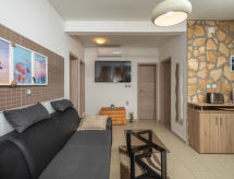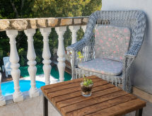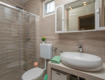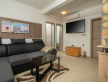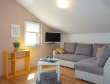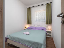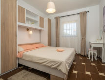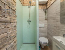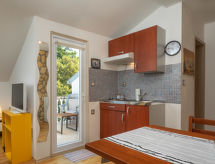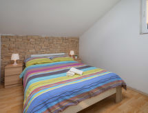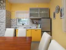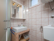 6 -sobna kuća 110 m2 na 2 etaže. Dnevni boravak/blagovaona s 1 kaučem za 2 osobe (140 cm, dužina 200 cm), TV-om sa sat. prijemnikom i klima uređajem. Izlaz na terasu. 1 soba s 1 franc. krevetom (160 cm, dužina 200 cm). 2 sobe, svaka soba s 1 franc. krevetom (140 cm, dužina 200 cm). Otvorena kuhinja (pećnica, perilica za suđe, 3 staklokeramičke ploče za kuhanje, toster, kuhalo za vodu, mikrovalna pećnica, zamrzivač, el. aparat za kavu). 2 x tuš/WC. Gornji kat: (vanjske stepenice) s kosim stropom dnevni boravak/blagovaona s 1 kaučem za 2 osobe (140 cm, dužina 200 cm), TV-om sa sat. prijemnikom i klima uređajem. Izlaz na balkon. 1 soba s kosim stropom s 1 franc. krevetom (160 cm, dužina 200 cm). Otvorena kuhinja (2 ploče za kuhanje, toster, kuhalo za vodu, el. aparat za kavu). Tuš/WC. Grijanje (uz doplatu), klima uređaj (uz doplatu). Balkon 4 m2. Ležaljke. Na raspolaganju: mrežice protiv komaraca, dječji krevetić. Internet (wireless LAN [WLAN], besplatan). Dodatna informacija: kuća za nepušače. Najviše 3 kućna ljubimca / psa dozvoljena. Katovi nisu interno povezani. U slučaju boravka manjeg broja gostiju od maksimalnog kapaciteta objekta, jedna etaža objekta neće biti na raspolaganju.- postrojenja