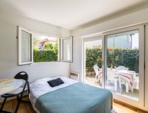 2 -sobni apartman 34 m2, u prizemlju. Lijepo uređen: dnevni boravak/blagovaona s 1 kaučem za 2 osobe (140 cm, dužina 190 cm), TV-om (plosnatim TV ekranom). Izlaz na terasu, na mjesto za sjedenje u vrtu. 1 soba s 1 franc. krevetom (140 cm, dužina 190 cm). Kuhinjska niša (2 ploče za kuhanje, 4 staklokeramičke ploče za kuhanje, toster, kuhalo za vodu, el. aparat za kavu, kombinirana mikrovalna pećnica). Kada, odv. WC. El. grijanje. Terasa 8 m2, mala vrtna terasa 15 m2. Garnitura za sjedenje. Pogled u daljini na more. Na raspolaganju: glačalo, sušilo za kosu. Internet (wireless LAN [WLAN], uz doplatu). Parking br. 117. Dodatna informacija: kuća za nepušače. 1 kućni ljubimac / pas dozvoljen. Protupožarni alarm. 64122002032BF- Značajke smještaja