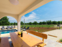 4 -sobna polovica dvojne kuće 120 m2 na 2 etaže. Lijepo uređena: dnevni boravak/blagovaona s 1 kaučem za 2 osobe (140 cm, dužina 190 cm), TV-om sa sat. prijemnikom i klima uređajem. Izlaz u vrt, na terasu. Otvorena kuhinja (perilica za suđe, 4 staklokeramičke ploče za kuhanje, mikrovalna pećnica). Tuš/WC. Gornji kat: predsoblje s klima uređajem. 1 soba s 1 bračnim krevetom (2 x 80 cm, dužina 200 cm), TV-om sa sat. prijemnikom. Izlaz na terasu. 1 soba s 1 franc. krevetom (160 cm, dužina 200 cm). Izlaz na terasu. 1 soba s 2 kreveta (80 cm, dužina 200 cm). Izlaz na terasu. Tuš/WC, bidet. Grijanje toplim zrakom. Terasa 40 m2 (djelomično natkrita), 2 terase 5 m2. Garnitura za sjedenje, vrtni roštilj (prijenosni), ležaljke. Pogled na bazen i vrt. Na raspolaganju: visoka dječja stolica, dječji krevetić (uz doplatu), sušilo za kosu. Internet (wireless LAN [WLAN], besplatan).- postrojenja