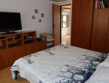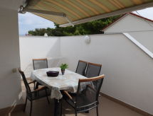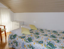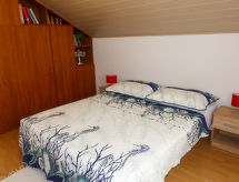 3 -sobni apartman 60 m2, u potkrovlju, prema jugu. Predsoblje s klima uređajem. 1 soba s kosim stropom, visina stropa 145 - 220 cm s 1 franc. krevetom (160 cm, dužina 200 cm). 1 soba s kosim stropom, visina stropa 145 - 220 cm s 1 franc. krevetom (160 cm, dužina 200 cm), TV-om sa sat. prijemnikom (plosnatim TV ekranom). 1 soba s 1 franc. krevetom (160 cm, dužina 200 cm), TV-om sa sat. prijemnikom. Blagovaona 10 m2, s kosim stropom, visina stropa 145 - 220 cm. S kosim stropom, otvorena kuhinja (pećnica, perilica za suđe, 4 plamena za kuhanje, kuhalo za vodu, mikrovalna pećnica, zamrzivač, el. aparat za kavu), visina stropa 145 - 220 cm. Tuš/WC. Klima uređaj (uz doplatu). Terasa 12 m2 (djelomično natkrita). Garnitura za sjedenje. Djelomičan pogled na more. Na raspolaganju: Internet (wireless LAN [WLAN], besplatan).- postrojenja