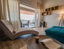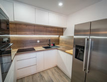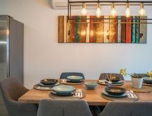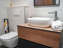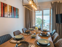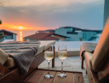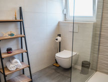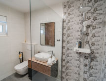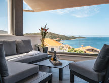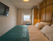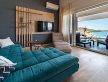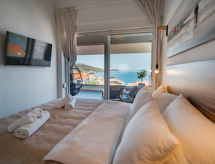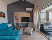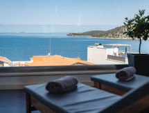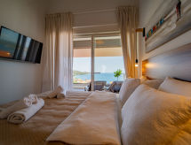 5 -sobna kuća 200 m2 na 2 etaže, prema zapadu. 1 soba s 1 franc. krevetom (180 cm, dužina 200 cm), TV-om sa sat. prijemnikom (plosnatim TV ekranom). Soba za igru s TV-om. Kuhinja (pećnica, perilica za suđe, 4 staklokeramičke ploče za kuhanje, mikrovalna pećnica, zamrzivač, el. aparat za kavu) s stolom za blagovanje i klima uređajem. Izlaz na terasu. Tuš/WC, odv. WC. Gornji kat: (vanjske stepenice) dnevni boravak s 1 kaučem za 2 osobe (140 cm, dužina 200 cm), TV-om sa sat. prijemnikom i klima uređajem. Izlaz na terasu. 1 soba s 1 franc. krevetom (180 cm, dužina 200 cm), TV-om sa sat. prijemnikom. Izlaz na terasu. 1 soba s 2 kreveta (90 cm, dužina 200 cm), TV-om sa sat. prijemnikom. Tuš/WC. Terasa 30 m2 (natkrita). Garnitura za sjedenje, vrtni roštilj (prijenosni), ležaljke. Prekrasan pogled na more. Na raspolaganju: sef, dječji krevetić. Internet (wireless LAN [WLAN], besplatan). 1 kućni ljubimac / pas dozvoljen.- postrojenja