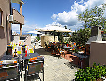 2 -sobni apartman 54 m2 na 1. katu. Dnevni boravak/blagovaona s 1 kaučem za 2 osobe i TV-om sa sat. prijemnikom (plosnatim TV ekranom), klima uređajem. Izlaz na terasu. 1 soba s 1 bračnim krevetom. Otvorena kuhinja (pećnica, 4 staklokeramičke ploče za kuhanje, mikrovalna pećnica, zamrzivač, el. aparat za kavu). Tuš/WC. Klima uređaj (uz doplatu). Terasa 9 m2 (natkrita). Garnitura za sjedenje. Pogled na more. Na raspolaganju: Internet (wireless LAN [WLAN], besplatan). Parking (ograđen).- postrojenja