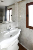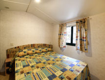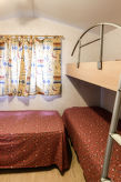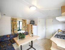 "Mobilhome B (AEG402)", 3 -sobna mobilna kućica 30 m2. Jednostavno uređena: dnevni boravak/blagovaona s kutom za blagovanje i TV-om. 1 soba s 1 franc. krevetom (160 cm). 1 soba s 1 krevetom (70 cm), 1 x 2 kreveta na kat (70 cm). Kuhinjska niša (4 plamena za kuhanje, zamrzivač). Tuš/WC. El. grijanje, klima uređaj. Vrtna terasa 12 m2. Garnitura za sjedenje. Parking (1 automobil). Najviše 1 kućni ljubimac / pas dozvoljen.- postrojenja