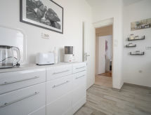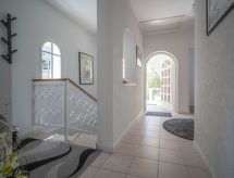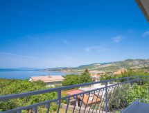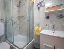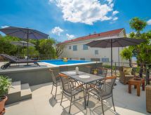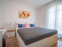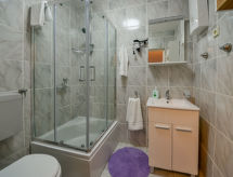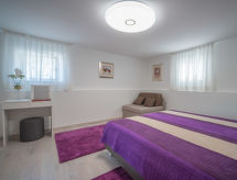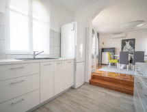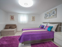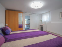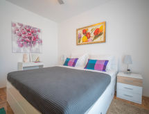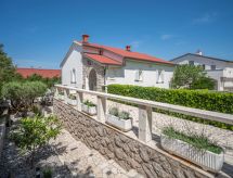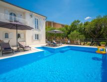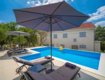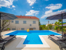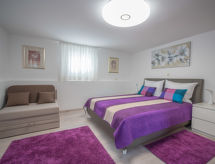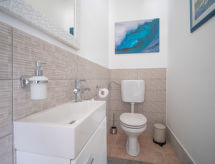6 -sobna kuća 250 m2 na 2 etaže, prema jugu. Dnevno-spavaća soba s 1 franc. krevetom (160 cm, dužina 200 cm), stolom za blagovanje, kuhinjskim blokom i TV-om sa sat. prijemnikom (plosnatim TV ekranom), klima uređajem. Dnevni boravak/blagovaona s 1 kaučem za 2 osobe (140 cm, dužina 190 cm), TV-om sa sat. prijemnikom (plosnatim TV ekranom), klima uređajem. 1 soba s 1 franc. krevetom (160 cm, dužina 200 cm). Otvorena kuhinja (2 staklokeramičke ploče za kuhanje, mikrovalna pećnica). 3 x tuš/WC. Gornji kat: dnevni boravak/blagovaona 40 m2 s 1 kaučem za 1 osobu (125 cm, dužina 190 cm), TV-om sa sat. prijemnikom (plosnatim TV ekranom), klima uređajem. Izlaz na balkon. 1 soba s 1 franc. krevetom (180 cm, dužina 200 cm). 1 soba s 1 krevetom (90 cm, dužina 190 cm). Otvorena kuhinja (pećnica, perilica za suđe, 4 staklokeramičke ploče za kuhanje, zamrzivač, el. aparat za kavu). Tuš/bidet/WC, odv. WC. Balkon 12 m2, terasa 12 m2. Garnitura za sjedenje, ležaljke. Pogled na more. Na raspolaganju: glačalo, dječji krevetić, sušilo za kosu. Internet (wireless LAN [WLAN], besplatan). Jedan apartman u prizemlju (zaseban, vanjski ulaz): dnevno-spavaća soba i otvorena kuhinja. Drugi apartman u prizemlju (zaseban, vanjski ulaz): dnevni prostor, otvorena kuhinja te 1 spavaća soba. Treći apartman u prizemlju, na 2 etaže (zaseban, vanjski ulaz): tuš/WC u prizemlju te dnevni prostor, otvorena kuhinja i 2 spavaće sobe na 1. katu.- postrojenja
