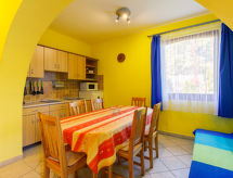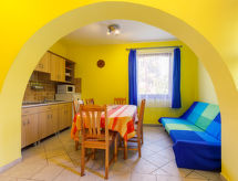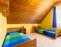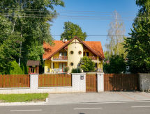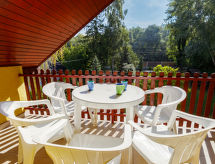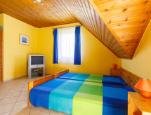 "Jókai", 6 -sobna polovica dvojne kuće 160 m2 na 2 etaže. Lijepo uređena: dnevni boravak/blagovaona s TV-om sa sat. prijemnikom. Izlaz na terasu. 2 sobe, svaka soba s 2 kreveta (80 cm, dužina 200 cm). Otvorena kuhinja (pećnica, 4 plamena za kuhanje, toster, kuhalo za vodu, mikrovalna pećnica, zamrzivač, el. aparat za kavu). Tuš/WC, odv. WC. Gornji kat: 1 soba s kosim stropom s 1 bračnim krevetom i TV-om sa sat. prijemnikom. Izlaz na balkon. 1 soba s kosim stropom s 2 kreveta (80 cm, dužina 200 cm), TV-om sa sat. prijemnikom. Tuš/WC. Bez grijanja. Tapison. 2 balkona, terasa (djelomično natkrita). Garnitura za sjedenje, balkonski namještaj, ležaljke (7). Na raspolaganju: dječji krevetić (uz doplatu). Internet (wireless LAN [WLAN]). Dodatna informacija: kuća za nepušače. SPTPS8WH- postrojenja