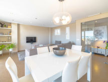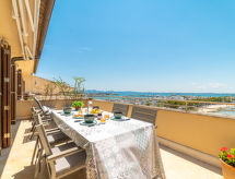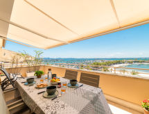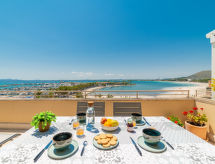 "Nautic Sea Views", 3 -sobni apartman 100 m2 na 5. katu. Objekt pogodan za 4 odraslih. Prostrano i svijetlo, potpuno renoviran, vrlo lijepo i moderno uređen: veliki dnevni boravak/blagovaona s kliznim vratima, panoramskim prozorom s stolom za blagovanje, TV-om, plosnatim TV ekranom, el. grijanjem, klima uređajem i grijanjem na topli zrak. Izlaz na terasu. 1 bračna soba s panoramskim prozorom s 1 franc. krevetom (150 cm, dužina 200 cm), el. grijanjem, klima uređajem i grijanjem na topli zrak. Izlaz na terasu. 1 bračna soba s panoramskim prozorom s 2 kreveta (90 cm, dužina 190 cm), el. grijanjem, klima uređajem i grijanjem na topli zrak. Kuhinja/dn. boravak (3 ploče za kuhanje, pećnica, perilica za suđe, mikrovalna pećnica, zamrzivač, el. aparat za kavu) s stolom za blagovanje. Izlaz na balkon. Tuš/WC. El. grijanje, klima uređaj. Velika terasa. Garnitura za sjedenje. Prekrasan panoramski pogled na more, planine i zaljev. Na raspolaganju: perilica za rublje, glačalo, visoka dječja stolica, dječji krevetić, sušilo za kosu. Internet (wireless LAN [WLAN], besplatan). Prikladno za obitelji. ETVPL15292- postrojenja