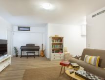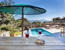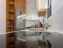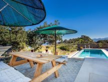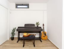 "Nesea", 5 -sobna vila 160 m2 na 3 etaže. Svijetlo, vrlo moderno uređena: veliki dnevni boravak/blagovaona s otvorenim kaminom i stolom za blagovanje. Izlaz na terasu, na bazen. Otvorena kuhinja (perilica za suđe, 4 staklokeramičke ploče za kuhanje, toster, kuhalo za vodu, mikrovalna pećnica, el. aparat za kavu). Izlaz na terasu. Tuš/WC. Donji kat: (stepenice bez rukohvata) dnevni boravak, bez prozora s TV-om sa sat. prijemnikom (plosnatim TV ekranom), klima uređajem. 1 bračna soba s 1 bračnim krevetom i klima uređajem. Odv. WC. Gornji kat: (stepenice bez rukohvata) 2 bračne sobe, svaka soba s 1 bračnim krevetom i tušem/WC-om. Izlaz na balkon. Balkonski namještaj, vrtni roštilj (prijenosni). Vrlo lijep panoramski pogled na more i bazen. Na raspolaganju: perilica za rublje, sef, glačalo, sušilo za kosu. Internet (wireless LAN [WLAN], besplatan). Dodatna informacija: kuća za nepušače. Protupožarni alarm, vatrogasni aparat. 1225740- postrojenja