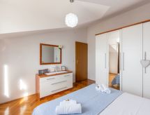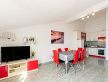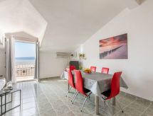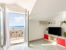 "Niko 1", 2 -sobni apartman 50 m2 na 3. katu, prema jugu. Dnevni boravak/blagovaona s kosim stropom, visina stropa 160 - 260 cm s 1 kaučem za 2 osobe (160 cm, dužina 200 cm), TV-om (plosnatim TV ekranom), klima uređajem. Izlaz na balkon. 1 soba s kosim stropom, visina stropa 160 - 260 cm s 1 franc. krevetom (160 cm, dužina 200 cm). Otvorena kuhinja (4 ploče za kuhanje, pećnica, zamrzivač, el. aparat za kavu). Kada/WC. Balkon 10 m2. Balkonski namještaj. Pogled na more. Na raspolaganju: sef, sušilo za kosu. Internet (wireless LAN [WLAN], besplatan).- postrojenja