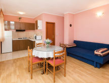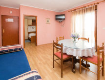 "Nikol (CKV122)", 2 -sobni apartman 35 m2 na 2. katu. Dnevni boravak/blagovaona s 1 kaučem za 2 osobe (160 cm, dužina 200 cm), TV-om sa sat. prijemnikom i klima uređajem. Izlaz na balkon. 1 soba s 1 bračnim krevetom (2 x 80 cm, dužina 200 cm). Otvorena kuhinja (2 plamena za kuhanje, toster, kuhalo za vodu, mikrovalna pećnica, zamrzivač, el. aparat za kavu). Tuš/WC. Grijanje (uz doplatu), klima uređaj (uz doplatu). Balkon. Balkonski namještaj. Na raspolaganju: Internet (wireless LAN [WLAN], besplatan). Dodatna informacija: kuća za nepušače. Najviše 2 kućna ljubimca / psa dozvoljena.- postrojenja