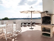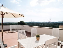 4 -sobni apartman u potkrovlju 84 m2. Prostrano i svijetlo, komforno i ukusno uređen: dnevni boravak/blagovaona s stolom za blagovanje, digitalnim TV, klima uređajem i grijanjem na topli zrak. Izlaz na terasu. 1 soba s 2 kreveta (90 cm). 1 soba s 2 kreveta (80 cm). 1 soba s 1 franc. krevetom (150 cm, dužina 190 cm), kadom/bidetom/WC-om. Velika kuhinja (pećnica, perilica za suđe, X, mikrovalna pećnica). Izlaz na terasu. Kada/bidet/WC. Klima uređaj, grijanje toplim zrakom. Veliki balkon 14 m2, velika terasa 80 m2. Garnitura za sjedenje, vrtni roštilj, ležaljke. Pogled na krajolik. Na raspolaganju: perilica za rublje. Internet (wireless LAN [WLAN], besplatan). Parking br. 9 (natkrit). HUTT002986- postrojenja