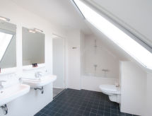 "Oesterdam 12", 7 -sobna kuća 104 m2 na 2 etaže. Komforno uređena: predsoblje s odv. WC-om. Dnevni boravak/blagovaona s plosnatim TV ekranom. Izlaz na terasu. 2 bračne sobe, svaka soba s 2 kreveta. Otvorena kuhinja (5 perilica za suđe, kuhalo za vodu, el. aparat za kavu, kombinirana mikrovalna pećnica) s stolom za blagovanje. Tuš. Grijanje. Gornji kat: 4 bračne sobe s kosim stropom, svaka soba s 2 kreveta. Kada/tuš/WC, duplim umivaonikom. Terasa. Garnitura za sjedenje. Na raspolaganju: Internet (wireless LAN [WLAN]). Parking (3 automobila) uz kuću. Dodatna informacija: kuća za nepušače. Protupožarni alarm.