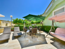 3 -sobni apartman 60 m2 na 1. katu. Lijepo i udobno uređen: dnevni boravak/blagovaona 25 m2 s TV-om sa sat. prijemnikom (plosnatim TV ekranom), klima uređajem. Izlaz na terasu. 1 soba s 1 bračnim krevetom (2 x 80 cm, dužina 200 cm). 1 soba s 2 kreveta (80 cm, dužina 200 cm), tušem/WC-om. Otvorena kuhinja (4 ploče za kuhanje, pećnica, perilica za suđe, el. aparat za kavu). Tuš/WC. Klima uređaj (uz doplatu). Terasa 14 m2 (natkrita), terasa 18 m2 (natkrita). Garnitura za sjedenje. Na raspolaganju: Internet (wireless LAN [WLAN], besplatan). Dodatna informacija: najviše 1 kućni ljubimac / pas dozvoljen. Vlastiti ulaz.- postrojenja