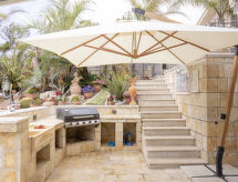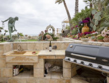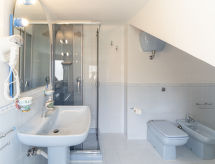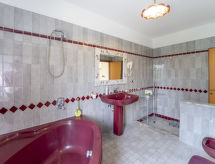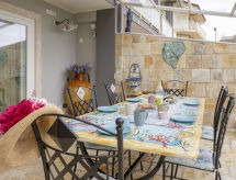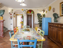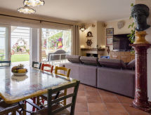 7 -sobna kuća 220 m2 na 3 etaže. Prostrano, renovirana godine 2018, komforno i moderno uređena: veliki dnevni boravak/blagovaona s otvorenim kaminom i TV-om sa sat. prijemnikom (plosnatim TV ekranom). Izlaz u vrt, na lođu. (4 ploče za kuhanje, pećnica, perilica za suđe, toster, kuhalo za vodu, mikrovalna pećnica, zamrzivač, el. aparat za kavu). Tuš/bidet/WC. Grijanje na plin, klima uređaj. Gornji kat: 3 bračne sobe, svaka soba s TV-om sa sat. prijemnikom (plosnatim TV ekranom). Izlaz na terasu. Kada/bidet/WC. 2. Gornji kat: 1 soba s kosim stropom s 1 kaučem za 1 osobu, 1 bračnim krevetom i tušem/bidetom/WC-om. Izlaz na terasu. 1 soba s 1 kaučem za 1 osobu, 1 bračnim krevetom, kadom/bidetom/WC-om i TV-om sa sat. prijemnikom (plosnatim TV ekranom). Izlaz na terasu. Vrlo lijep pogled na more. Na raspolaganju: perilica za rublje, glačalo, sušilo za kosu. Internet (wireless LAN [WLAN]). 1 kućni ljubimac / pas dozvoljen.- Značajke smještaja