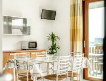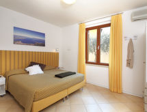 2 -sobni apartman 45 m2. Lijepo uređen: dnevno-spavaća soba s 1 kaučem za 2 osobe, stolom za blagovanje, TV-om sa sat. prijemnikom i klima uređajem. Izlaz u vrt, na balkon. 1 bračna soba s klima uređajem. Otvorena kuhinja (4 staklokeramičke ploče za kuhanje, mikrovalna pećnica, zamrzivač, el. aparat za kavu). Tuš/bidet/WC. El. grijanje. Balkon ili terasa. Garnitura za sjedenje, balkonski namještaj. Na raspolaganju: sef, visoka dječja stolica. Internet (wireless LAN [WLAN], uz doplatu). Parking (1 automobil). Dodatna informacija: apartman za nepušače. Najviše 1 kućni ljubimac / pas dozvoljen. Vlastiti ulaz. Na licu mjesta nema naplate dodatnih troškova, osim boravišne pristojbe. 017102-RTA-00004- postrojenja