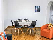 3 -sobni apartman 80 m2 na 1. katu. Komforno i lijepo uređen: dnevni boravak/blagovaona s TV-om (plosnatim TV ekranom), klima uređajem. Izlaz na terasu. 1 velika soba 13 m2 s 2 kreveta (90 cm, dužina 200 cm), klima uređajem. Izlaz na balkon. 1 velika soba 17 m2 s 1 franc. krevetom (160 cm, dužina 200 cm), klima uređajem. Izlaz na terasu. Kuhinja (pećnica, perilica za suđe, 4 Indukcione ploče, toster, kuhalo za vodu, mikrovalna pećnica, zamrzivač). Izlaz na terasu. Tuš/WC, odv. WC. Podno grijanje. Parketni pod. Terasa 13 m2. Garnitura za sjedenje. Pogled na na grad. Na raspolaganju: perilica za rublje, glačalo, sušilo za kosu. Internet (wireless LAN [WLAN], besplatan). Dodatna informacija: protupožarni alarm. 06088009697WF- postrojenja