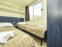 4 -sobna mobilna kućica 32 m2, prema zapadu. Dnevni boravak/blagovaona s TV-om sa sat. prijemnikom (plosnatim TV ekranom), klima uređajem. Izlaz na terasu. 1 soba s 1 franc. krevetom (140 cm, dužina 190 cm). 2 sobe, svaka soba s 2 kreveta (70 cm, dužina 190 cm). Otvorena kuhinja (4 ploče za kuhanje, zamrzivač). Tuš/WC. Terasa 14 m2 (djelomično natkrita). Garnitura za sjedenje. Pogled na more. Na raspolaganju: perilica za rublje, sušilo za kosu. Internet (wireless LAN [WLAN], besplatan).- postrojenja